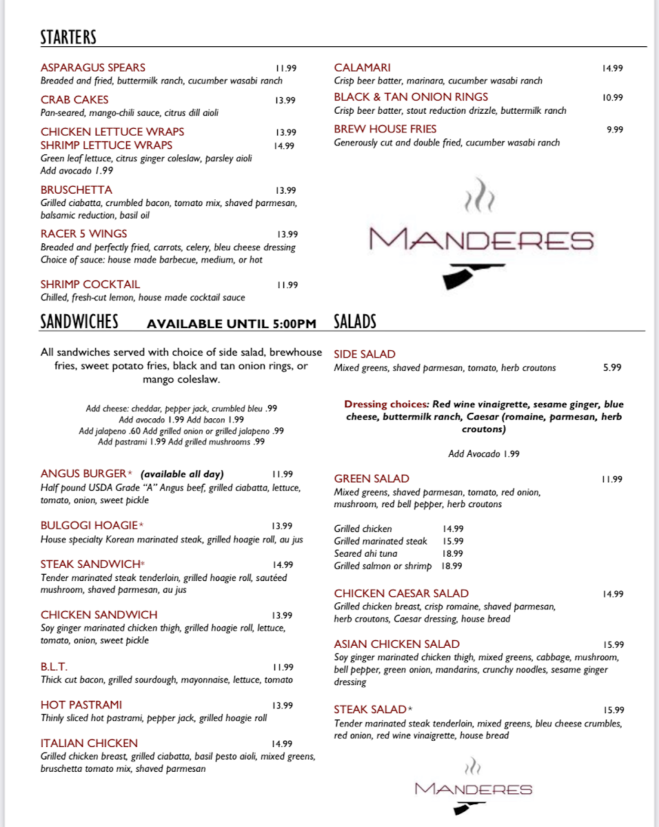 At Manderes, the culinary experience is nothing short of exceptional. Their menu features a delectable array of dishes, highlighting the restaurant's commitment to comfort food that feels like home. Begin your meal with the Brew House Fries, expertly double-fried to perfection and served with the restaurant's signature Cusabi sauce. If you’re an onion ring aficionado, don’t miss the Black and Tan Onion Rings, crispy and perfectly battered, drizzled with an Irish stout for a flavorful twist. For something refreshing, the Asparagus Spears paired with buttermilk ranch sauce is irresistibly crispy and a delightful way to start.